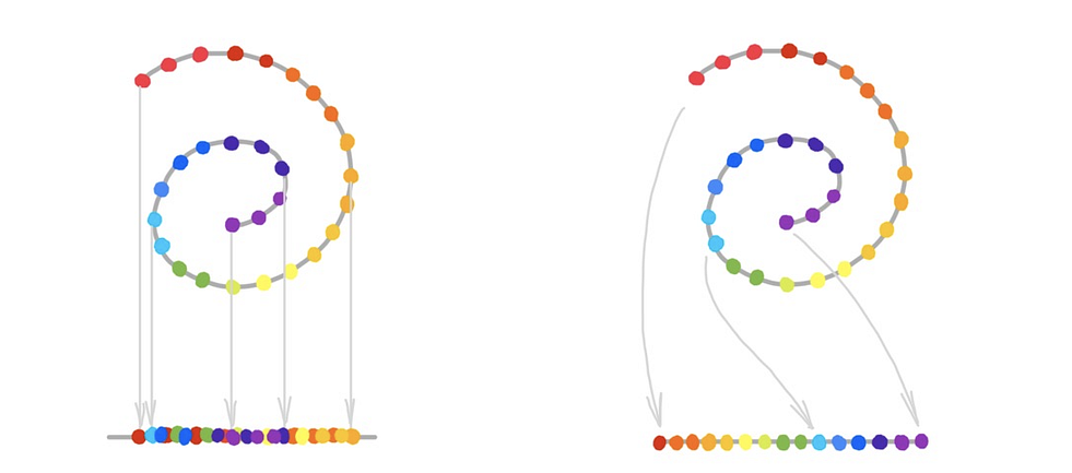 DGCNN and DGM bear conceptual similarity to a family of algorithms called manifold learning or non-linear dimensionality reduction, which were extremely popular in machine learning when I was a student in the 2000s, and are still used for data visualisation. The assumption underlying manifold learning methods is that of the data having an intrinsic low-dimensional structure. Though the data can be represented in a space of hundreds or even thousands of dimensions, it only has a few degrees of freedom, as shown in the following example: